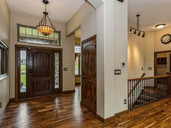 Beautiful custom-built home situated on a 4-acre lot at the end of a cul-de-sac, offering privacy and a natural setting with timber. This home features all natural stone brought in from Utah. This stone is used both on the exterior and interior of the home, adding a touch of elegance and durability. The interior features high volume ceilings throughout, creating a spacious and airy atmosphere. The kitchen is designed for chefs and includes all appliances. It also features a large breakfast bar for dining and entertainment. The layout is designed with a split bedroom design, which can provide added privacy for the primary suite. The lower level of the home offers a bar area and an abundance of stone in the game area and rec room, creating a cozy and inviting space. There is a bonus exercise room that includes a built-in swim spa/hot tub, providing a convenient space for relaxation and fitness. A unique feature of the property is the safe room located under the front porch, accessible from the basement. This can serve as a secure area during severe weather events or other emergencies. Oversized 4 stalls attached garage, with additional garage below, which can be used for gardening tools, lawn equipment, a dog wash area. The home is equipped with Geothermal heating and cooling and solar panels. Along with the high efficiency “Green House” insulation, with 2x6 walls, 2” of insulation under the concrete slab. This combination results in low utility costs, with an average monthly expense of only $73 for electric and gas utilities. Overall, this custom-built home offers a luxurious and energy-efficient living space with a strong focus on quality, privacy, and functionality. It combines modern amenities with natural elements, making it an attractive and unique property.