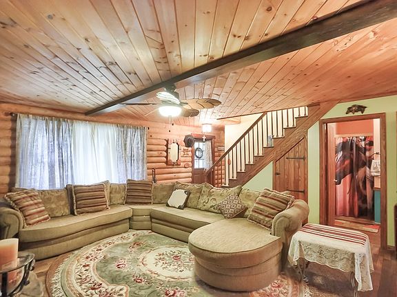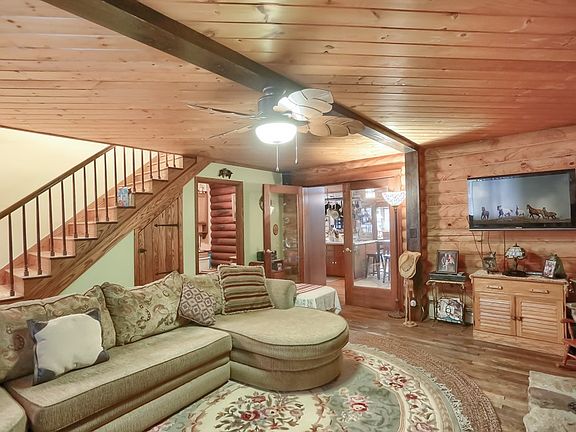 This secluded horse farm is situated on a partially wooded 34.68 acres and includes 4 bedrooms, 3 bathrooms, and a brand new horse barn. All bedrooms are upstairs and have an immense amount of closet space, wood floors, and ceiling fans. The master suite includes a sitting area and a 3/4 bath with a skylight and solid surface countertop vanity. The home is half log, half stick built and boasts two living areas (one with a propane fireplace and the other is woodburning), hardwood floors throughout, a first floor bathroom and laundry, an eat in kitchen with ample cupboard and counter space. The kitchen is fit for a king and features an island with a jennair stove top and a prep sink, wall oven, dishwasher, and sliding glass doors out to a covered porch. The formal dining room includes a bay window along with a sliding glass door out to the deck overlooking a neighboring 5 acre lake! Also included is a 2 story insulated dog kennel with whelping boxes and high quality gun dog doors!