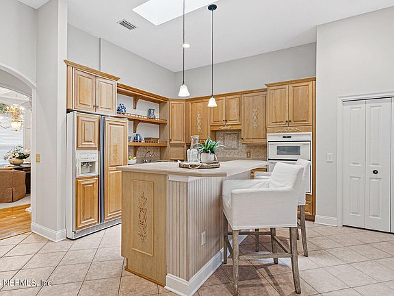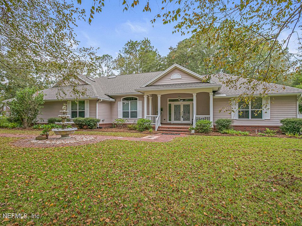 3 bed 2.5 bath, 3379sf home sitting on 3.31 acres, landscaped & wooded areas, trails & even a creek. Rural lifestyle but only minutes to everything needed including River City Market Place & Jax Int'l Airport. Add'l multi purpose room measures 19 x 25 includes half bath, separate 1 ton AC, (2) 220 outlets & double door exterior access with great potential for Generational Living. Loads of storage, large indoor laundry room with washer & dryer included. Rear yard shed 14 x 16 built to match home has separate electrical panel. An additional large storage shed in rear of property as well. Mechanical room houses air handlers, hot water heater & recirculation pump for hot water. Architectural elements, high ceilings, mill work, solid oak flooring, NEW ROOF & freshly painted interior. Wonderful screened & tiled back porch. Rear entry garage which is wheelchair accessible. Large tiled covered entry porch. Nearby horse boarding & acreage allows horse on propert
