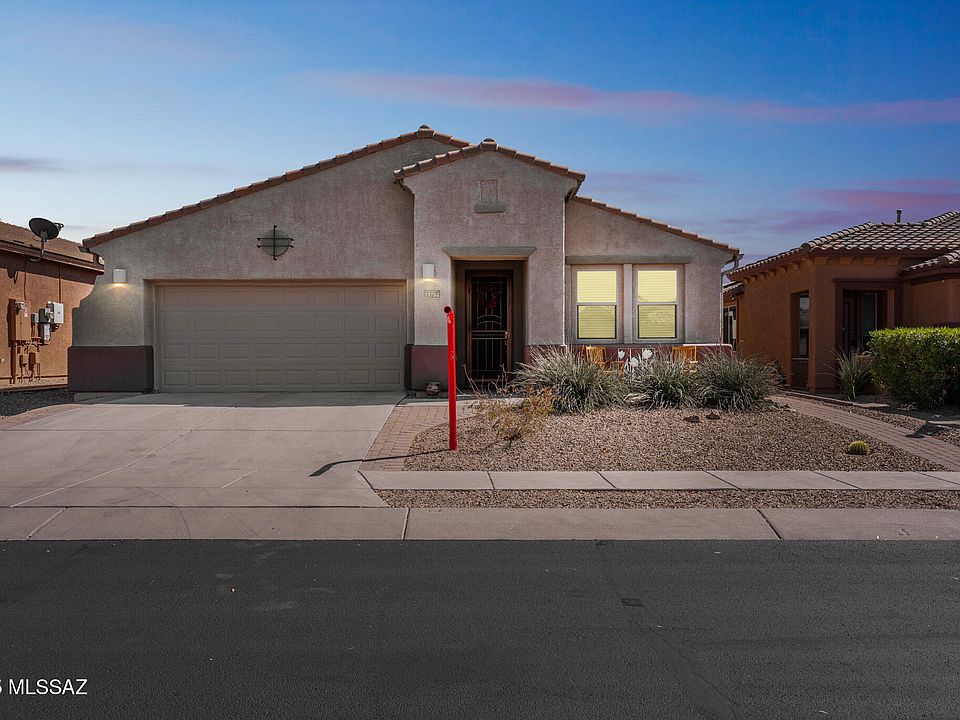 Great Price for this wonderful 2BR+Den/2BA Floorplan in 55+ active adult community of Del Webb at Rancho del Lago located on a quiet street.New compressor for A/C (8/2025).Ceramic Tile everywhere except primary BR.Kitchen w/large breakfast bar,maple cabinets,granite counters,large pantry & cabinet pullouts.Multi purpose rm can be used for exercise or additional TV room.Oversized family rm wired for surround sound.Primary BR w/bay window & 2 walk in closets.Primary bath w/large shower,bench & dual vanities plus makeup area.Guest BR w/murphy bed which allows for craft room/2nd office.Back patio is extended w/pergola ramada,beautiful flagstone & wonderful low care landscaping.Extended garage w/lots of storage.All appliances,furniture & kitchenware included at no extra cost if interested