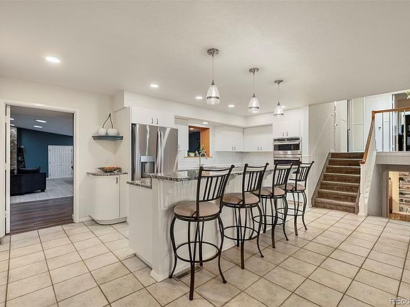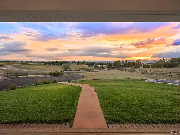 Welcome to your serene five-acre ranch, offering breathtaking views of the Front Range! While the property offers a peaceful, country feel, it's just 8 minutes from Parker’s historic Main Street—an unbeatable location! This property is lovingly referred to as the Hammered Peacock and it blends modern upgrades with a touch of Southwestern charm. The living room features bay windows that frame mountain vistas and a cozy Southwestern-style fireplace. The dining room boasts curved walls, bay windows, and custom tile flooring with a stunning mountain backdrop. The fully remodeled kitchen has granite countertops, a large island with bar seating, premium stainless-steel appliances, a subway tile backsplash, pendant lighting, and a spacious walk-in pantry. The 1400 SF recreation room is sure to impress with a full wet bar, a floor-to-ceiling fireplace and French doors leading to a beautiful deck and private yard complete with a hot tub. This entertainer's dream space is ready for your personal touch. Upstairs, the primary suite offers stunning mountain views, vaulted ceilings, bay windows, plantation shutters and an adjoining room that can serve as a reading area, office or workout space. The en-suite 5-piece bathroom features a soaking tub, a separate shower, and dual sinks with plenty of closet space. The upper level also includes two additional bedrooms, a full bath, and a ¾ bath. The lower level family room with a fireplace has been converted into a non-conforming bedroom but could easily be converted back if desired. There's also an additional large bedroom in the basement for extra accommodation. End your day on the covered front porch watching the sun set over the mountains. For horse enthusiasts, the property includes a 2-stall barn, fenced pastures and neighborhood bridle paths. Conveniently located near E-470, you're just a short drive from the DTC, downtown Denver, the mountains, and DIA. Come enjoy some of the best views of the Front Range mountains!