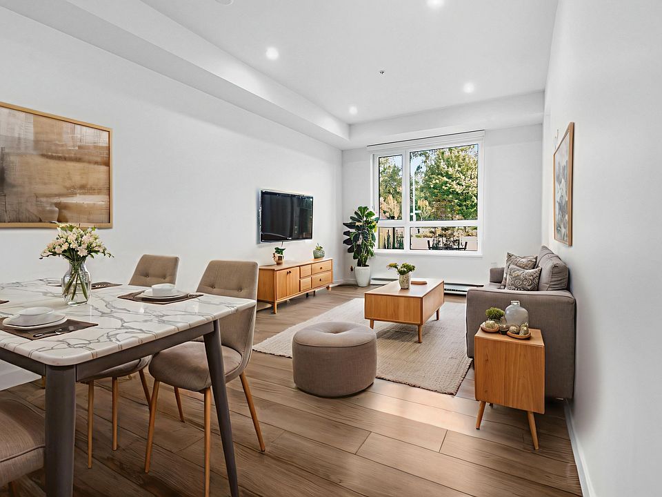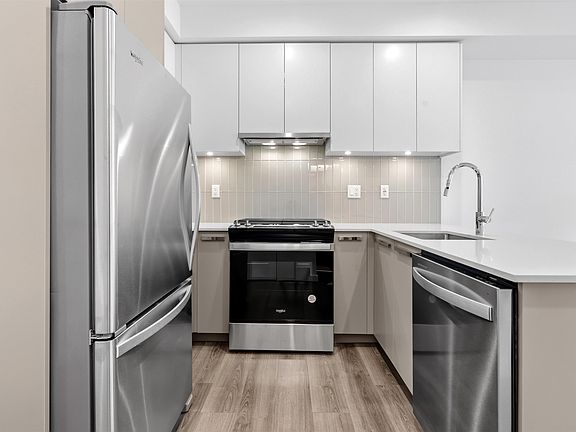 Welcome to Silva 1! This ground-level, 1 bedroom and 1 bathroom features a spacious ground-floor patio offering easy access to nearby parks and bus stops, perfect for relaxation or hosting. Enjoy refined cooking on a gas stove, complemented by premium finishes throughout — stainless steel appliances, quartz countertops, wide-plank flooring, in-suite laundry, and an elegant double-sink bathroom. Located in the heart of East Newton, you’ll be within walking distance of shops (Costco, Superstore, Canadian Tire, restaurants, and schools. The building features numerous amenities: a beautifully designed courtyard, fully equipped fitness center, co-working area, social lounges, community kitchen, and more. This is the perfect home for first-time home buyers, young couples or investors!