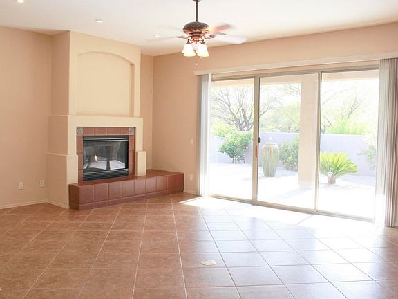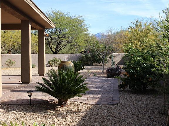 Pride of ownership throughout lovely home near Vistoso Golf Course in vibrant community of Oro Valley. Inviting courtyard entrance with custom wrought iron gate has desert landscaping. Welcoming, open floor plan is perfect for entertaining, rich wood cabinets in kitchen, granite countertops, 5 burner gas stove, pantry, built-in dining buffet, 2 fireplaces, covered patio, water fountain, large back yard with side gate. Huge master bedroom with large walk in closet, separate shower and jetted tub, add to spaciousness. Laundry room, has lots of cabinets and a utility sink. Garage has spaces for 3 cars, epoxy floor, super water softener system and newer in house vac. Solar tube, solar screens, LED lighting, beautiful fixtures, fruit trees enhance home! Gated community near Catalina State Park.