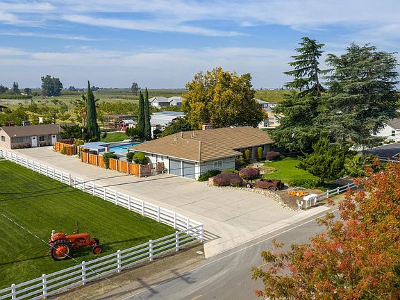 Experience country luxury at its finest on this 11.4-acre estate featuring a ADU and incredible amenities. A 7,500 sq. ft. shop boasts 3-phase power, 14' roll-up doors with openers, office, loft, 50's-style ice cream shop & 1/2 bath. The main home offers 2,452 sq. ft. with 3 bedrooms, 3.5 baths, hardwood flooring, and a chef's kitchen with granite counters, large island, Sub-Zero refrigerator, and pro-grade appliances. Enjoy separate living and family rooms, a stylish fireplace, and laundry with exterior access. Step into the resort-style backyard with pool, spa, putting green, outdoor bar, BBQ, and wood-burning pizza oven. The new detached apartment includes 1 bedroom, 1 bath, full kitchen, laundry hookups, and central HVAC - and an office space with gym. Outdoor fun abounds with pickleball/basketball court (with wet bar & half bath), batting cage, axe throwing, putting greens, horseshoe pit, bocce ball, animal coop, and dog kennel, all professionally lit for nighttime enjoyment. Driveways are designed to accommodate large RVs or semi-trucks, while cross-fenced pastures with hot wire and irrigation flooding make this property ideal for animals or future agricultural pursuits. All landscaping is on automatic systems for ease of care. This peaceful private estate has it all!