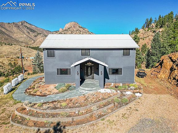 This stunning custom-built home offers the best of Colorado living, perfect as a primary residence, second home, or vacation retreat. Nestled on a sprawling 20-acre lot with easy highway access, it’s just 13 miles north of Woodland Park and a short drive south from Pine Junction. Surrounded by scenic views and backing up to the national forest, this property seamlessly blends luxury, comfort, and outdoor adventure. Inside, the main level boasts an impressive kitchen with an island and sleek stainless-steel appliances, and the washer and dryer are conveniently included. The dining room, open and full of natural light, is ideal for gatherings. The home is equipped with an efficient automatic pellet stove with a remote sensor for convenient heating, and new windows throughout ensure energy efficiency and enhanced aesthetics. Upstairs, you'll find three spacious bedrooms with large closets. The primary suite is a true sanctuary, featuring vaulted ceilings, a walk-in closet, and a luxurious bathroom with a jetted tub offering views, a steam shower, and elegant fixtures. Custom showers and tubs add an extra layer of sophistication, while ceiling fans and ample storage complete the space. The exterior is equally impressive. Professionally landscaped with zero-scaped gardens and three garden beds, the property is designed to showcase Colorado's natural beauty. Outdoor speakers set the perfect ambiance for entertaining. Practical features add convenience, including a two-car carport, a newer water pressure tank, updated well pumps, and additional storage options. Plus, a charming spiral staircase adds character to the layout, making this custom home a true masterpiece inside and out. Embrace the mountain lifestyle with unparalleled comfort and style in this one-of-a-kind property. Don't miss this incredible opportunity!