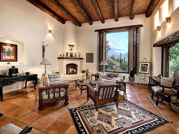 More stunning than words can describe, this architecturally significant mud adobe stucco, Santa Fe-style home by master home builder Mark Butler, leaves no details left to the imagination. Perched on a hilltop, nestled into the Catalina Mountains with stellar mountain views on 5.93 glorious saguaro studded acres. A long and winding drive leads to the arched entry with wooden lintel and saguaro ribbed gate into the courtyard with fountain and flagstone floor. If you like southwestern, Santa Fe and rustic, there are no rooms better than this great room -- soaring viga ceiling with skip-pealed latillas, hand-adzed lintels and corbels, a charming kiva fireplace, expansive picture windows with enviable Rincon Mountain views. The generous southwestern-style kitchen offers a beamed ceiling, ceiling, a beehive fireplace with banco seating, Talavera tile counters, saguaro ribbed cabinetry, large center island with a 5-burner gas stove, and a light & bright breakfast nook with a beamed and saguaro ribbed ceiling. Featured in the main house are 3 bedrooms (den/study could be 3rd bedroom) including a gracious primary suite with dual vanities, soaking tub, separate shower, and dual walk-in closets. The charming casita offers beamed ceilings, viga columns and corbels, kitchenette and world-class wine cellar. The glorious and freshly painted exterior has an expansive back porch, a spool built into the hillside and flagstone floors. Two-car garage, one-car carport, charm, character, unmatched quality, privacy, views and timeless design await you.