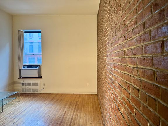 This bright studio features exposed brick walls, 11-foot ceilings, and oak hardwood floors, creating an airy, loft-like feel. The tall ceilings also allow the option to install a loft bed, maximizing living and workspace.
