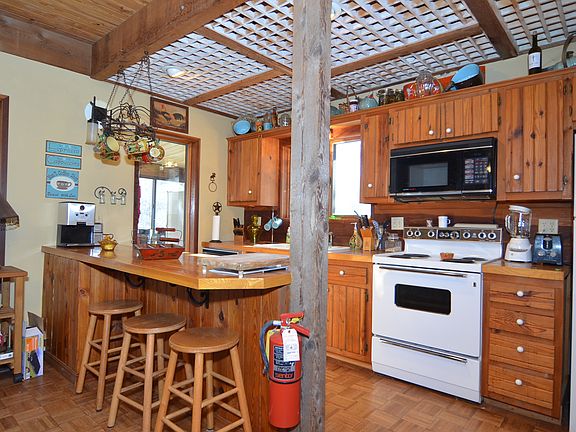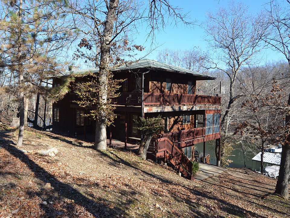 Holway Point waterfront in Drowning Creek,3-story rustic cabin in the woods,deep cove,200 of shoreline,gentle slope,covered dock with lift,2 hydroports, great views,copper wood stove,community beach & boat ramp,2 car detached metal garage,sold furnished