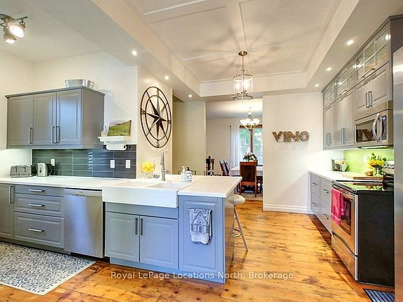 Renovated 4 bedroom, 2.5 bathroom home in the centre of Thornbury. This home offers a variety of inviting spaces including a formal living room, large dining room, generous kitchen, den/office, attic family/media room, patios, hot tub, large fenced yard and plenty of storage. Historic character combined with modern updates including, large covered porch with stone arches & stairs, stone window sills, original wood floors, stunning stained glass, double pocket doors, two interior staircases, exposed red brick, 9.5 foot ceilings, new kitchen & bathrooms, metal roof on main house, asphalt shingles on back roof, paved driveway, shed, two patios, landscaping, exterior wood board and batten on rear, updated electrical panel(200amp), gas fireplace, furnace, AC, in-floor heat and radiators. Centrally located within walking distance of school, community centre, library, trails, the marina, parks, downtown Clarksburg and Thornbury. Close to skiing, golf, hiking, cycling trails and of course Georgian Bay. Enjoy walking into town for dining, browsing the shops, Olde Fashioned Christmas and Canada Day Celebrations.