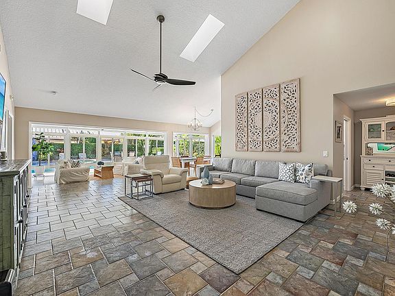 Nestled in the desirable coastal community of The Ridge at the Bluffs, this beautifully updated three-bedroom, two-bath home combines relaxed Florida living with timeless comfort and style. The light-filled, open floor plan showcases vaulted ceilings and spacious living areas that flow seamlessly to the gorgeous pool and patio area, creating an effortless indoor-outdoor lifestyle.The kitchen features stainless steel appliances, white cabinetry, and a breakfast area overlooking the pool -- perfect for entertaining. The adjoining great room offers volume ceilings, a neutral palette, and expansive space that opens to the sunroom and outdoor living area. A versatile Florida room, framed in glass, serves as a bright second lounge or home office, blending indoor comfort with poolside views. The primary suite provides a tranquil retreat with wood flooring, generous closet space, and a fully remodeled spa bath featuring dual vanities, marble-style tile, and a frameless glass shower. Guest accommodations include two inviting bedrooms one a loft-style suite with soaring ceilings, ideal for family, guests, or a work-from-home setup. Additional highlights include a newly renovated guest bath, a dedicated laundry room with custom cabinetry, and an attached two-car garage.
