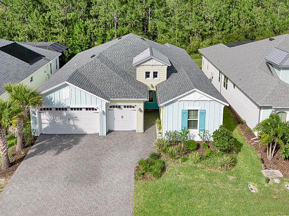 This highly desired St. Bart model home boasts 3 bedrooms, 3 full bathrooms, dining room, a den w/ French doors, 3-car garage, and so much more. You will notice several upgrades as you enter the great room with a striking coffered ceiling, cool porcelian tile flooring, plantation shutters, and ceiling fans in every room. Primary bedroom and ensuite spa like bath with seamless shower enclosure and large soaking tub. Ventilated wood shelving in all closets. Screened extended lanai that backs up to private wooded preserve with a natural gas hookup for your grilling pleasure. Close to Town Square ! HOA covers your landscaping, lawn care, and access to all these amazing amenities. The resort-style pool, sports pool, fitness center, mango theater, pickleball courts, Latitude Bar & Grill and the ocean-front Beach Club with a shuttle service for you to enjoy.