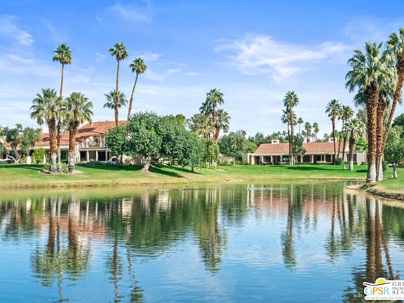 BEST VALUE IN Mission Hills Country Club. TRUSTEE HAS PRICED TO SELL and paid in full for the land lease extension! Discover opulence in this meticulously remodeled, spacious condo, nestled in the serene beauty of Mission Hills. Glass walls open to expansive views of the patio, greenbelt, pool, and the lake beyond, enhanced by vaulted ceilings and stunning tiled floors. The kitchen, bathed in natural light, features an oversized island perfect for culinary adventures. The generous guest bedroom offers privacy and has its own access to the front patio, while the oversized master bedroom seamlessly connects to the outdoors. Modern fixtures adorn tastefully redesigned bathrooms, creating a sophisticated ambiance with ample closet space. Convenience meets style with a large double garage, golf cart garage, and adjacent storage room. Explore the vibrant Mission Hills community, surrounded by breathtaking mountain views and world-class amenities. Enjoy 54 golf holes, 59 tennis and pickle-ball courts, croquet courses, a gym, and a rejuvenating spa. The remodeled Clubhouse beckons with fine spirits, casual and fine dining options, serving as a perfect social hub. Seize the opportunity to make this haven your home, where luxury harmonizes with lifestyle. Your oasis in Mission Hills promises an elegant retreat with recreation and awe-inspiring views.