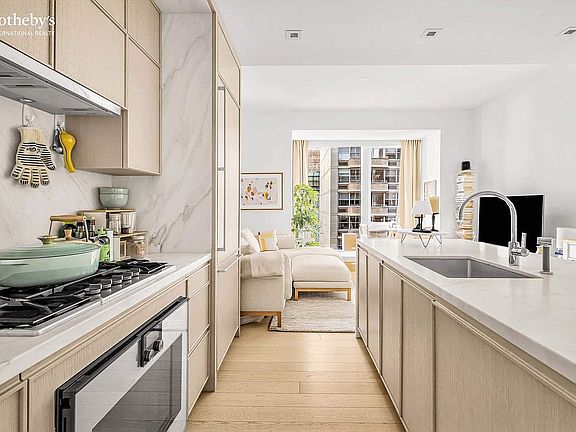 Designed by Champaulimaud. Unit 17B one bedroom, one-and-a-half-bathroom residence offers northern exposure with floor-to-ceiling windows. complete a chef’s kitchen offering honed Capri marble countertops, backsplash, and a waterfall island with room for seating. The kitchen has a refined aesthetic with streamlined custom white oak millwork that seamlessly integrates a full Gaggenau appliance package, including an undercounter wine refrigerator, complemented by Dornbracht fixtures.