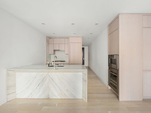 The tranquil, marble-clad primary bathroom is a retreat in itself, featuring Bianco Dolomiti radiant-heated floors, Marno Illusion stone-tiled walls, and a custom vanity in white oak rift-cut veneer with matching Marno Illusion countertops. Additional details include a built-in medicine cabinet, Kallista sink, and Dornbracht fixtures. Completing this sophisticated home are a Nest Learning Thermostat and an in-unit Bosch washer and dryer.