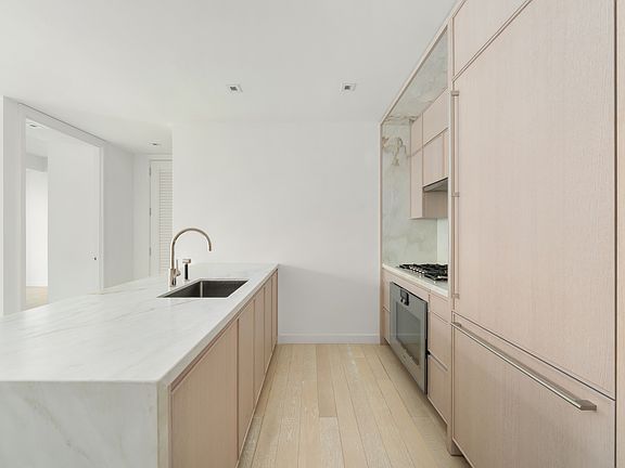 This elegant one-bedroom, one-bathroom residence, designed by Champalimaud, showcases sweeping northeast views of the Manhattan skyline through expansive floor-to-ceiling windows. White oak flooring extends from the entry foyer into a spacious open-concept living and dining area, anchored by a chef's kitchen featuring honed Capri marble countertops, backsplash, and a waterfall island with seating. The kitchen's refined aesthetic is defined by streamlined custom white oak cabinetry that seamlessly conceals a full Gaggenau appliance suiteincluding an undercounter wine refrigeratorand is complemented by Dornbracht fixtures.