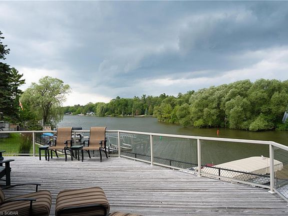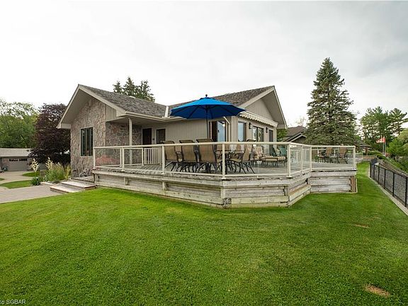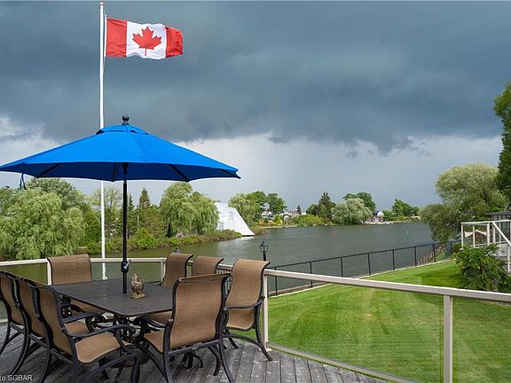 Located directly across from Nancy Island and with stunning westerly sunsets enjoy this 66.2 ft gorgeous riverfront property with steel riverwall, manicured lawns, 3 bdrm 2 bath winterized home with riverfront decks, spectacular 4 car garage all set behind a private gated entrance. This unique private property with its spectacular sunset views offers a charming year round home or winterized vacation property with master on the main level, 4 pc bath and bright open concept living room, family room with cozy fireplace, kitchen and dining area all with hardwood throughout and panoramic views of the river. Fully finished lower level offers add'l family room, 3 pc bath, 2 guest bedrooms, laundry facilities and separate entrance. For that car enthusiast enjoy an incredible 1184 sf detached 4 car garage. Lawn sprinklers and natural gas to the property to easily convert. For all your boating needs this home has access to stairs to riverside boardwalk with electric available and steel riverwall. Available for your immediate enjoyment. Step in now and start making your own family memories with this one of a kind riverfront property. Close to all east end amenities and just a short walk to the shores of Georgian Bay.