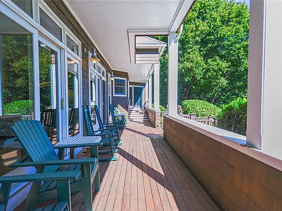 Discover this stunning contemporary home blending warmth & charm. 3 bedrooms and 3 1/2 bathrooms have sunlight streaming through large windows throughout. Nestled on a private 1-acre fenced lot with mature trees and lovely landscaping, it offers winter water views of Easton's Pond. Enjoy a secluded, peaceful setting just a 10-minute drive from Newport. A wrap-around mahogany porch spans the home's length. Attached 2-car garage, outdoor shower, and potential for more living space above the garage. The open floor plan welcomes you to an entry foyer with a handsome slate floor and a 2-story soaring cathedral ceiling, Dining/Living room has floor-to-ceiling windows with transom lights, filling the space with natural light. Enjoy the warmth of a gas fireplace. The gourmet kitchen has granite counters, bay windows, oak cabinets, floor-to-ceiling cupboards, a large granite-top island, and a pantry. The 1st-floor primary bedroom/bath suite offers a huge walk-in closet with rich wood cabinets/shelves. The bedroom features custom tall cabinets & sliders to the porch. The 2020 bathroom renovation includes quartz countertops, glass-enclosed walk-in shower, soaking tub, radiant heat in the floor & shower seat. An office with built-in shelves, and an additional 1/2 bath completes the 1st floor. Upstairs, 2 spacious bed and bath suites offer comfort & privacy. This home combines contemporary design with inviting character—for relaxed coastal living in an exceedingly private setting.