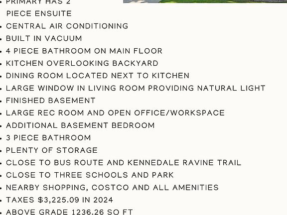 4 beds: 3 up/1 down. New furnace 2015, new windows 2015, new A/C 2015, new roof 2015, HWT 2010. 2387 total sq ft finished living space on 2 levels. 50 metres to Kennedale Ravine. Large windows provide tons of natural light. Kitchen has plenty of counter & cupboard space w/sink in front of the window overlooking large backyard. Primary is spacious w/2 pc ensuite. 2 addt'l bedrooms on main for a total of 3 beds up. Roller shutters on front of home provide black out comfort for sleeping, heat insulation & security. 4 pc full bath on main. Finished basement has large rec room, additional basement bedroom & 3 pc bath w/shower. Laundry room is massive w/plenty of additional storage. Large backyard, deck in great shape, gazebo included. Veggie garden behind garage. Surrounded by mature trees, next to the ravine…ideal for families & pet owners. Ravine proximity = valuable location. 2025 taxes: $3451 Large home: 1236.23 up and 1151.40 down. Heated double detached garage is another 647 sq ft. 1 block to bus route.