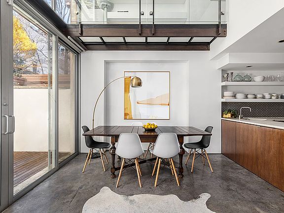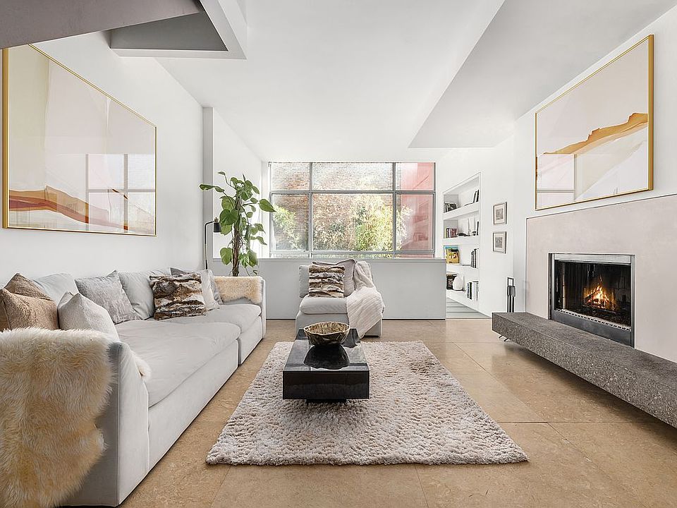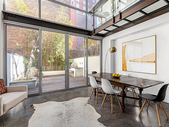 From the moment you enter through oversized iron doors into a mudroom and gallery-style entry, the home sets a tone of elevated, livable elegance. The main living floor features double-height ceilings, a wood-burning fireplace, and oversized windows facing south and west, with no direct visibility from neighbors — a true rarity in NYC living.
