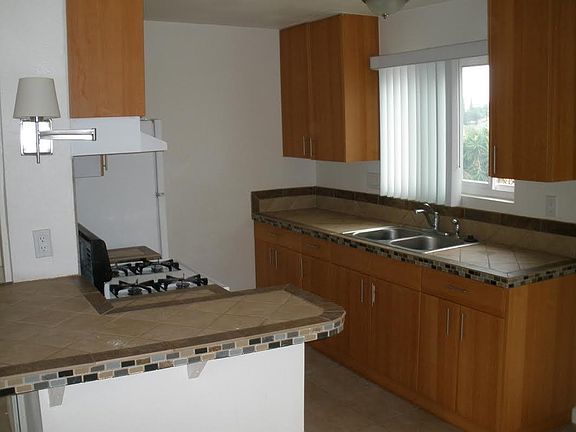 Fully remodeled interiors with new kitchens and baths with tiled countertops. Gas stove and heating. Tiled floors throughout. Light and airy. Large bedrooms, huge living room. Very cute 8 unit complex with small amount outside area for the unit. Quiet street and living environment. 1 off street parking space with ability to rent a 2nd space if desired. Nice patio area for building for barbecuing etc. Owner pays water, hot water,sewer, trash. Tenant pays gas and electric.