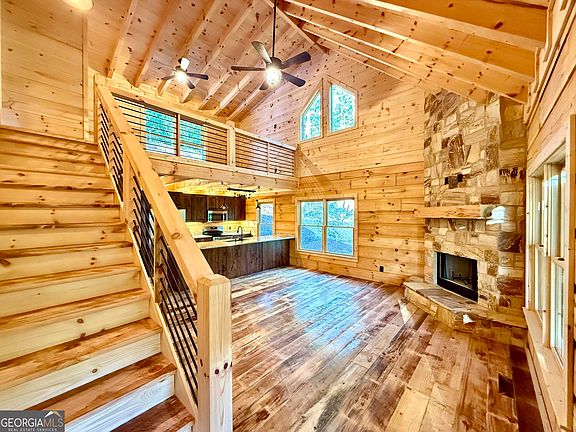 ** NEW CONSTRUCTION! ** This stunning, genuine log cabin is nestled on a 1.06 acre lot within the serene mountains of Ellijay located behind the gates of the highly desirable Preserve at Mountaintown Creek. Enjoy total privacy in this cozy and rustic log cabin including 168 feet of creek frontage along the calming sounds of Flat Branch Creek. Custom touches are found throughout including beautiful upgraded wood floors, exposed beams, french doors leading to the spacious master suite deck, and beautiful floor-to-ceiling stacked stone wood-burning fireplaces are found in both the soaring great room and main level deck. Kitchen and bathrooms feature real wood cabinets, granite counter tops, a farmhouse sink, and custom vessel sinks. Surrounded by nature just 15 mins. west of Hwy 515 and downtown Ellijay, both the main level and master decks offer breathtaking views that must be seen to be appreciated! In addition, this cabin offers a spacious loft with flexible space for an office or sitting area, a dedicated parking pad comfortably accommodating up to 3 cars, and a crawl space under the back deck for additional storage. As part of The Preserve at Mountaintown Creek, residents enjoy a private gated community with access to amenities including a pool, brand new pickleball courts and a pavilion. Whether you're looking for a primary residence, place to retire, weekend getaway, or investment property, this beautiful log cabin is an opportunity you won't want to miss!