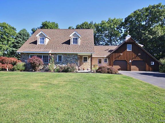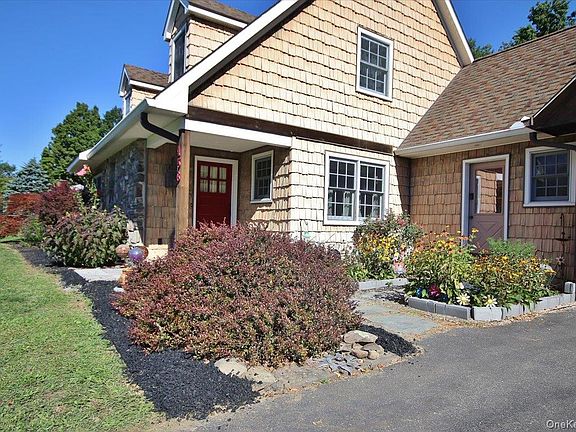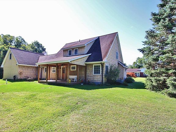 This unique Cape Cod is located in the Gottscheer Country Club in the Town of Montgomery , N.Y. This home's warmth and inviting beauty combines field stone, vinyl shingles and board and batten to give it that distinctive look. The first floor has characteristic wood ceilings throughout and original wide plank floors with custom nails that go from the hall, half bath, pantry / storage room into the kitchen and dining area. The residence has a master bedroom with an ensuite bathroom that has Shiplap style wood, offering a rustic aesthetic look. The master bedroom offers a walk-in closet, a linen closet and an additional closet with double wood bi-fold doors .Additionally the main floor has a cozy living room with grille wood windows, a stone gas fireplace and an eat-in kitchen with a food island that seats two and offers additional meal prep space to boost functionality in the kitchen. The dining area has bountiful sunlit windows that overlook nature's beauty. In addition there is a laundry room, a charming half bath, a room that could be used as a pantry / storage area and a coat closet. The second floor has two bedrooms; one bedroom offers two large walk-in closets and an additional storage room, the second bedroom offers one large walk-in closet. The second floor also has a full bath and a bonus room that can be transformed into a variety of functional spaces, each with its own unique purpose such as home office , music room or den. The bonus room also has a walk-in storage closet. The oversized 2 car garage has an unfinished second floor with a separate electric box from the main house. The spacious upstairs area can be entered through the garage or a separate entrance from outside. The possibilities are endless to what it can be transformed into. There is a substantial storage shed with an overhead door in the back yard. The unfinished basement is part full basement and part crawl space. The basement can be accessed from the main floor or a Bilco door. The house has special features to include central air conditioning, a central vacuum system, an intercom between the first and second floors and a whole house fan in the attic. This endearing home features a large amount of storage space. The wide molding framing the doors, windows and baseboards enhance the rooms to give it that distinctive decorative element. Enjoy the private walk out the covered deck located off the kitchen in the back of the house on the .92 acre landscaped property.
