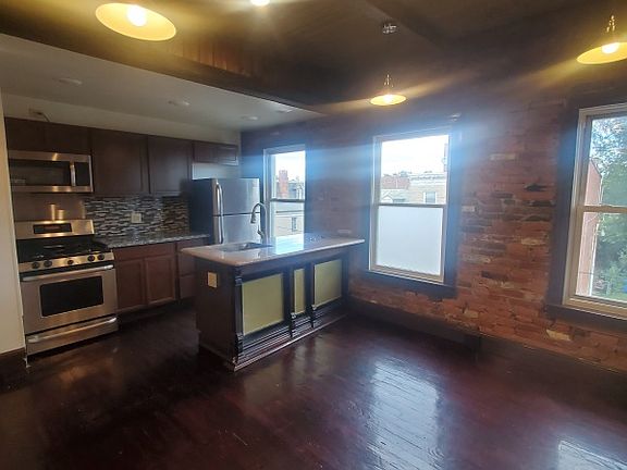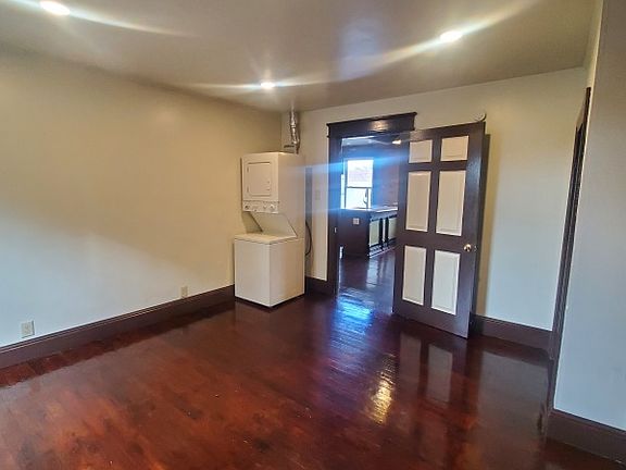 1 bed, 1 bath third floor apartment with wood floors and exposed brick. Bedroom, full bath (shower only), combination living/ kitchen with stove, refrigerator and dishwasher. In-unit washer/dryer. No pets and no smoking indoors.
