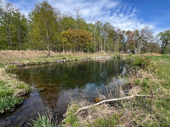 Spring fed pondsFruit treesProtected orchardLarge brick fireplacePellet stovesWide plank cedar flooring