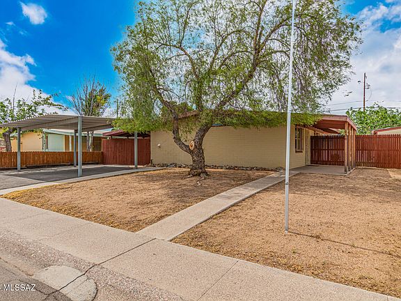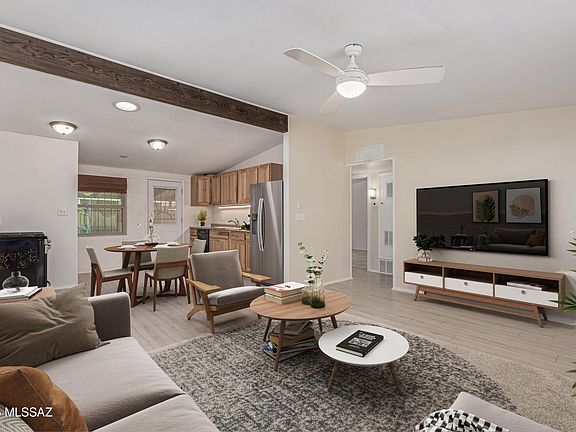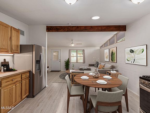 Motivated Seller**Discover comfort and character in this delightful 2-bedroom, 1-bath home, perfectly positioned to capture breathtaking mountain views. The spacious backyard is a blank canvas, ready for your personal touch. A mature Palo Verde tree offers natural shade for outdoor relaxation, while the covered carport adds everyday convenience. Step inside to an inviting open floor plan with vaulted ceilings, exposed beams, and stylish wood-look flooring throughout. Both bedrooms are generously sized, providing peaceful retreats. Enjoy Arizona evenings on the covered patios, and take advantage of the alley access, a handy storage shed, and ample outdoor space to create your ideal desert oasis. Home is being sold As-Is.