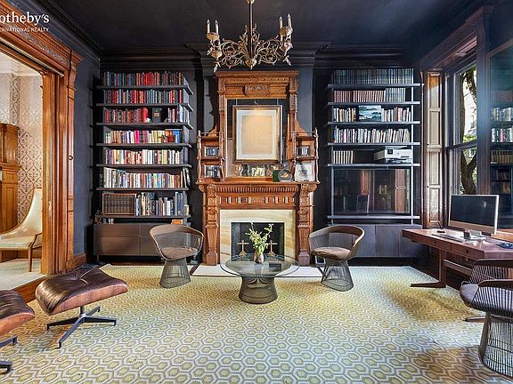 Parlor Level: Twelve-foot ceilings and dramatic sightlines reveal a stunning library framed by a carved fireplace and custom bookshelves. Historic brass lighting complements the architectural detail. The flowing layout connects the drawing room, music room, and living room to a garden-view office with stained-glass transom and terrace access—each room anchored by its own fireplace.