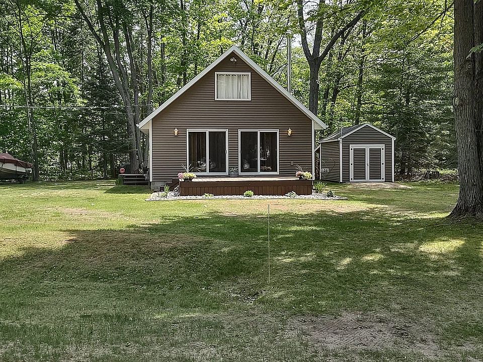 Cozy three bed one bath 1176 sq feet chalet in quiet Lake James neighborhood whether you are looking for a year-round home or a weekend escape this property is turnkey ready, Lake James is a private All sports lake in Prudenville Michigan with Houghton Lake nearby newer furnace with air conditioning, newer appliances and a woodstove for a cozy winter setting ,partially furnished also a 10 x 15 shed 12 x 20 carport and an extra lot behind the cabin to expand call for a showing of this beautiful property.