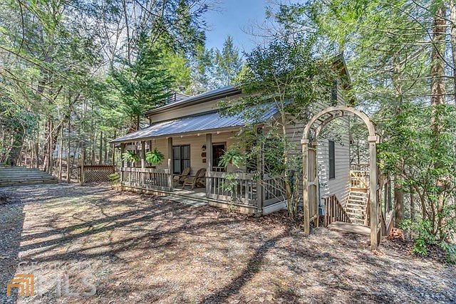 Creekfront cabin nestled on wooded lot w/beautiful hemlocks, view & sounds of Turniptown Creek. This cabin is loaded w/character; it's cozy, yet has plenty of space w/ 3 bedrooms & 3.5 baths. Great room features a massive wood burning fireplace w/barn wood mantel, flanked by built-in shelves, pickled wood walls, cathedral ceilings, exposed beams & hardwood floors. The 2nd living area has a wall of windows overlooking the creek, w/nice dining area. Lg master suite on main, plus guest en-suite on main. Bed & bath upstairs w/sleeping loft. This cabin has bright, happy rooms! Lots of porches & decks to enjoy the creek. (Furnishings Negotiable) Rustic gated community, public water, all paved roads, less than 5 miles from Ellijay. (Adjacent lot available)