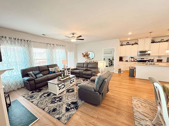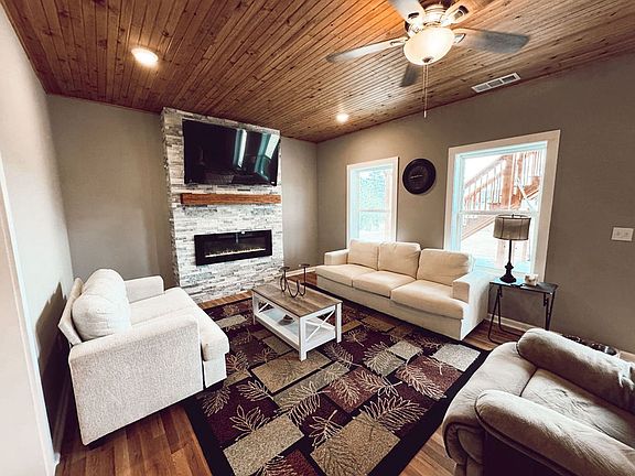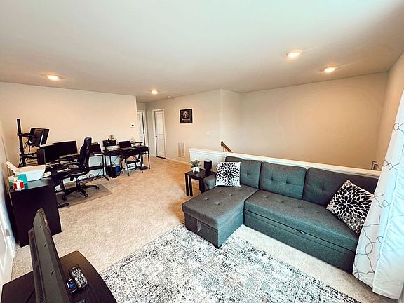 The spacious layout features a main-level primary suite, a finished basement with a bar, game room, and additional living space. Additional highlights include a cozy loft, two fireplaces, TVs in every room, a private porch and patio, and a two-car garage. Residents also enjoy access to the community pool and fitness center, along with professional lawn care included in the lease.