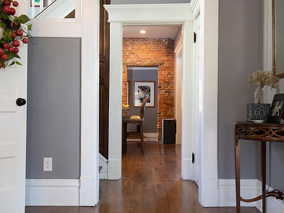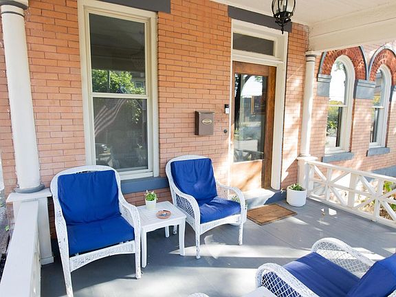 This stunning 2,699 sq ft home offers 4 spacious bedrooms and 3.5 baths, blending vintage charm with modern amenities. Featuring an open floor plan, hardwood floors throughout, and exposed original brickwork, the ambiance is warm and inviting. The main level includes a first-floor laundry, an eat-in kitchen with white cabinetry, stainless steel appliances, and granite countertops, plus two dramatic floor-to-ceiling brick fireplaces in the living and dining areas. Upstairs, the second floor hosts a master suite with dual closets and a private bath, along with two additional bedrooms and a full bath. The third floor boasts a versatile living space and a second full master suite. Additional highlights include white woodwork and doors throughout, a fenced yard, patio, welcoming front porch, and a detached two-car garage. Located just minutes from downtown, this home offers the perfect blend of character, comfort, and convenience.