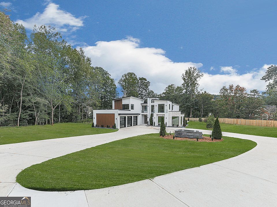 Brand New Construction. This is truly a STUNNING 5-Bedroom 5.5 Bathroom Home, in the Modern Contemporary Style, located on 2.27 Acres of Prime Marietta Real Estate. The Seller built this home for himself (but has decided to sell it instead), and No Expense Has Been Spared. As you enter the Majestic Front Gates, a Circular Driveway with Ornate Island Fountain welcomes you home. To your right is a massive private, fenced yard with irrigated Zoysia lawn, plus treed wilderness areas flanking the front left and right of the property. Ahead, with stunning white walls, black window frames, black standing-seam roof, and stone and wood accent inlays, this magnificent home stands proud and defiant of mediocrity. To the left is the Side Entrance 3-Car, Glass Door Garage with Textured Epoxy Coated Floor, and straight ahead is the imposing, off-center 9.5' High Wooden-Slate Door. You have arrived. Entering the 2 Story Foyer, the Raindrop Chandelier overhead entices you in. Before you is the huge Great Room Expanse with recessed ceiling and architectural inlay lighting, the Italian Porcelain Tiled Floor (24"x48" Size Tiles) and Glass Front Fireplace. To the left of this is the Gourmet Kitchen with Massive Kitchen Island (76" x 116"), Quartz Counter-Tops and Back-Splash, Walnut Colored and White Gloss 54" Cabinets, LG Stainless Steel Appliance including Wall Mounted Microwave and Convection Oven, Gas Oven, Gas Counter Cooktop, Designer Extractor Hood, Pot-Filler, Dishwasher, Deep Stainless Steel Sink (17" x 30" by 10" deep), Dishwasher and Double-Door LG 'Studio' Freezer-Fridge with Ice-Maker. A Walk-In Pantry with built-in custom shelving complete the kitchen area. Overhead is more recessed and inlay lighting, with the Italian Floor Tiles flowing through to the spacious Dining Area, while huge windows stream in the light. Still on the main Level is a spacious Study, 2nd Living Room or Games Room/Den, Half-Bathroom, plus an 'In-Law' Bedroom With Full Bathroom on Suite. Stepping outside is a Covered Patio running 2/3 the length of the home with Built-In Outdoor Kitchenette featuring a Quartz Counters, 4-Burner Natural Gas Grill, Wine Fridge, and In-Counter Stainless Steel Sink. This faces the massive, heated in-ground pool (38' x 16') and jetted spa . Surrounding the pool are large concrete slabs with evergreen artificial turf (this is as about as 'low maintenance' as a pool can be). The backyard is completed with more irrigated Zoysia grass and a row of evergreen cypress trees. Moving upstairs we have a bespoke staircase with White Oak 'Floating Steps', Steel Frame and Glass Balustrades. A huge 12' x 4' wide window streams in the light. Arriving upstairs you'll be greeted by an Expansive Loft Area with 9' Ceilings and French Doors opening out onto a central undercover Patio Deck, with Glass-Panel Balustrade, overlooking the Pool and Backyard area. The Upper Level features 3/4" x 9.5" wide White Oak Floors that run throughout that level, except for the bathrooms which feature 24"x24" tiled floors, and the undercover patio. On this level we have the Master Bedroom and 3 Secondary Bedrooms, all featuring On-Suite Full Bathrooms. The Master Bedroom features a built-in longitudinal 'Under TV' Cabinet and walks-out directly onto the upper patio via a side door, and boasts views of the backyard pool area. The Master Bathroom features a Freestanding Tub, Enclosed Shower with Ornate 'Wood-Style' Tiling and Dual Vanities with Quartz Countertops and Dual Walk-in Closets with Custom Closet Systems. This home offers so much for the discerning buyer. The value represented here is exceptional and one would be very hard pressed to find anything comparable in value, in this area, even close to this price point. This is indeed a very rare find and is expected to sell fast.
