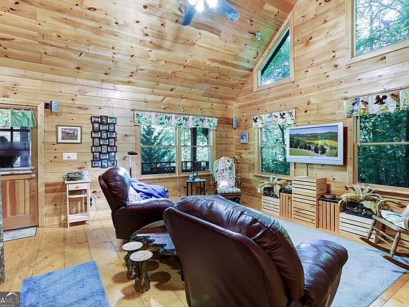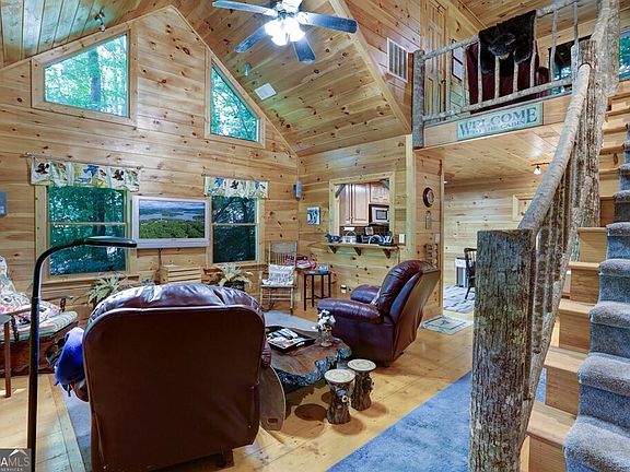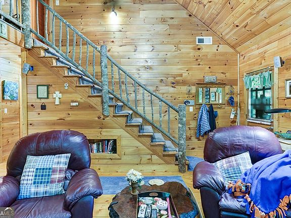 Imagine absolute privacy in the serene embrace of the North Georgia Mountains! Discover ultimate seclusion on a beautifully wooded 1.5-acre lot, just moments from the heart of Young Harris Valley. This meticulously maintained cabin boasts an all-wood interior and feels brand new, having been sparingly used by its original owners as a second home. The cabin's open and spacious great room is perfect for entertaining, featuring a large dining area that seamlessly flows into a well-equipped kitchen with stainless steel appliances. The master bedroom is conveniently located on the main floor and offers a private porch, providing a serene escape. Upstairs, the second bedroom comes with a full bath, and a charming loft overlooks the great room, adding a touch of rustic elegance. A large half bath includes ample storage and a dedicated laundry room, while the covered front porch offers year-round mountain views and overlooks a picturesque pasture. Energy-efficient windows, central heating, and air conditioning ensure comfort throughout the seasons. The paved driveway provides good parking and easy access. Situated just minutes from Lake Chatuge, golf courses, Brasstown Valley Resort, and Young Harris College, this cabin perfectly balances privacy and convenience.