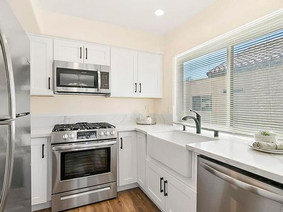 Welcome to this beautifully remodeled 2-bedroom, 2-bath corner/end unit condo in the highly desirable Corsica community of El Cajon. Offering 1,162 sq. ft. of stylish living space with only one shared wall, this home features an open-concept layout filled with natural light, modern finishes, and thoughtful upgrades throughout. The updated kitchen with all new cabinets, countertops and appliances flows seamlessly into the dining area which features additional cabinets and wine fridge offering additional storage and space. Relax and entertain in the soothing living space with fireplace, new plantation shutters and energy efficient HVAC system. Spacious bedrooms with vaulted ceilings and renovated bathrooms including all new primary shower add comfort and convenience, while the primary suite provides a private retreat. Easy access with the attached single car garage with laundry, new water heater and a nearby assigned parking space for an additional vehicle. Conveniently located near shopping, dining, and freeways, 1380 East Washington Avenue #5W is move-in ready and waiting for you.