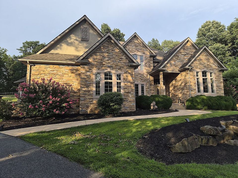 Stacked stone exteriorBeautifully landscaped groundsPrivate backyard oasisUnfinished walk-out basementTranquil pondIn-ground swimming poolVaulted ceilings