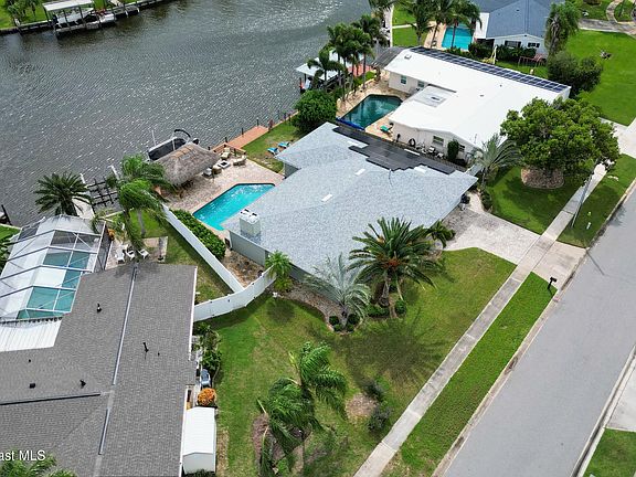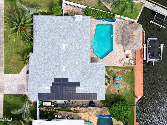 Embrace the essence of Florida waterfront living in the desirable Diana Shores community of Merritt Island! This exceptional home sits on an extra-wide, deep navigable canal, perfect for boating, fishing, and sunset cruises. Enjoy a private dock, boat lift, and tiki hut, along with a large heated pool for year-round enjoyment. The open living areas flow effortlessly into a spacious Florida room, featuring a gas fireplace and built-in grill, ideal for entertaining or unwinding. Inside, the split-bedroom floor plan provides privacy and comfort, while upgrades like a Generac whole-house generator and solar power deliver peace of mind and energy efficiency. A seamless blend of elegance, functionality, and coastal charm awaits. 2024 Roof!