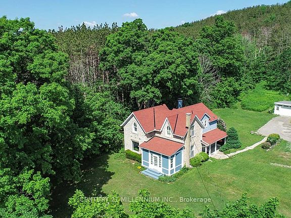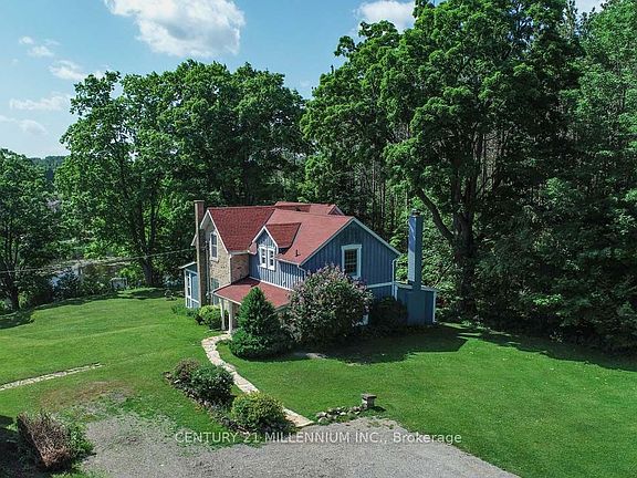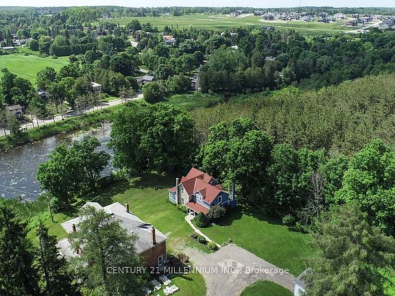 Elegantly perched on the hill, overlooking the lower Mill Pond, is this charming 3-bed, 1.5 bath, stone residence, known as the Algie Family House, with steep gable roofs, in the Victorian Gothic Style. Entrenched in area history, this home was once home to the parents of William Algie, known for constructing the Algie Family home, the neighboring red brick, William Algie House, and the stone mill complex, which operated as, The Beaver Knitting Mill, in 1881, where the Alton Mill currently stands, revitalized today. Comprised of the same local limestone as the Alton Mill, this home exudes warmth and character, sides, & backs to the forest, and sits on a mature .63 acre lot with southerly views. A covered side porch leads to a large Mud rm. Eat-in country Kitchen enjoys views over the b/yard & forest, home to many deer, turkeys, birds and wildlife. Intimate Family rm has forest views & a wood-burning fireplace. Dining open to the Sunroom w/ walkout to the yard. Large formal Living w/ hdwd flooring & large picture window as a focal point. 2nd level has a large walk-in linen. Primary w/ large walk-in closet. Bed #2 could also be used as a Primary w/ hdwd flring, a vaulted ceiling, a walk-in closet with built-in organizers & overlooks the pond. Bed #3 has laminate flring & o/looks the pond and grounds. Come and experience the beauty of Alton with peepers peeping, ducks, geese, red-wing blackbirds, swans, deer, and wildlife! Enjoy quaint restaurants, craft breweries, farmers markets, coffee shops, walking to neighbourhood parks, the bike pump track, the Alton Public School, the Caledon library, and nearby hiking trails and conservation areas with streams & waterfalls. Alton is a small village in Caledon, home to the Millcroft Inn & Spa, the Alton Mill Arts Centre, Hill Academy, TPC Toronto Golf course at Osprey Valley & more! All major shopping amenities in nearby Orangeville.1-hr to TO.