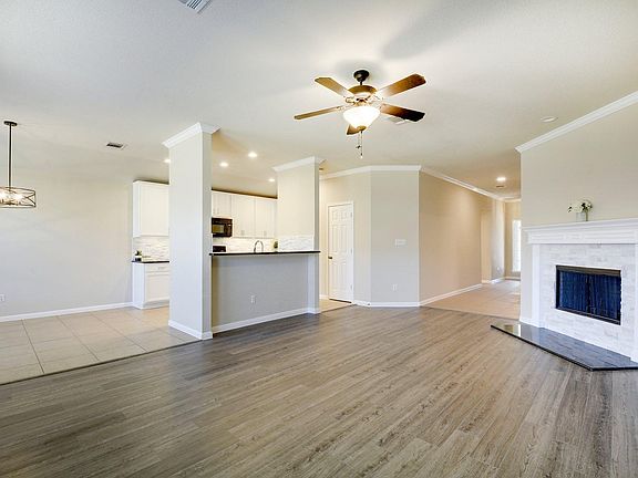 Gorgeous kitchen! The kitchen has granite countertops, travertine backsplash, LED recessed lighting, deep stainless steel sink, and updated light fixtures. There is an oversized breakfast bar. The kitchen is open to the living and dining room. The beautiful hand scraped, wood looking vinyl planks are throughout the house, including in the bedrooms. There is no carpet in the home. 2-inch faux wood blinds.
