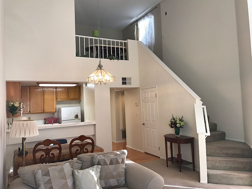 Don't miss the opportunity to own a TOP LEVEL condo in the highly desirable Harbour Walk community. This well-kept 2 bedroom and 2 bath home features an open floor plan with VAULTED CEILINGS and a wall of windows that create a bright and inviting space. The entry and kitchen is lined with nice laminate flooring and opens to the spacious dining and living room with a cozy fireplace. The master suite has a walk-in closet and a sliding glass door to a balcony where you can enjoy your morning cup of coffee. Located upstairs is the second loft style bedroom overlooking the living room with a closet and a private bath. Other features include stackable washer/dryer, central A/C and heating system, 2 gated parking spaces and a resort style gated community with a pool and spa. Very conveniently located next to grocery stores, lots of restaurants, gyms, and easy access to the 110 freeway.