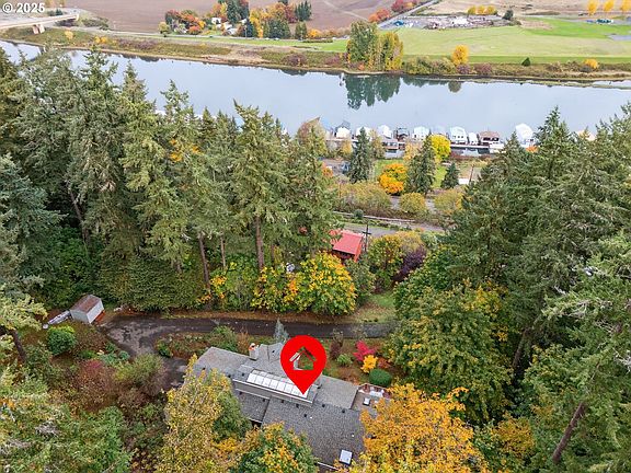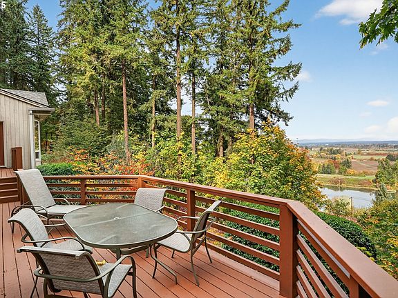 Perched above the Willamette River, this Northwest Contemporary home offers a rare blend of tranquility, privacy, and convenience. Set on 3.72 acres of terraced grounds and old-growth trees, it feels like luxurious treehouse living. Enjoy sweeping views of the forest, river, Mt. St. Helens, and Sauvie Island from nearly every room. Inside, cedar-lined vaulted ceilings, skylights, and an open floor plan flood the home with natural light. The living room features a dramatic wall of windows and fireplace - perfect for cozy mornings watching storms roll through. The remodeled chef’s kitchen flows seamlessly off the main living area and features stainless steel appliances, granite slab counters, cherry cabinets, hardwood floors, and garden windows overlooking lush greenery. The main-level primary suite is a peaceful retreat with two walk-in closets, fireplace, heated floors, sauna, and private deck with hot tub for stargazing. Additional spaces include generous guest bedrooms, an office (or 4th bedroom), and a versatile lower-level family room with high ceilings and serene views. Step outside to a generous wrap-around deck designed for year-round enjoyment. Birdwatchers will delight in the spectacular wildlife—from hummingbirds to bald eagles. The grounds include a lush NW-Asian fusion garden and fruit orchard. Addl amenities include a finished two-car garage with acrylic flooring, a detached shed, and a fully conditioned crawlspace. Recent updates: fresh paint, new carpet, and refinished hardwood floors. Just minutes to Sauvie Island, NW Portland, Scappoose, OHSU, and under 30 minutes to Nike and Intel. A true Pacific Northwest retreat!