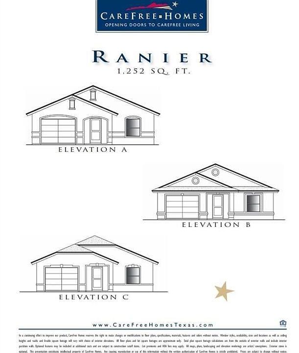 Carefree Homes Rainier Plan - Three Bedroom single level home with open concept, living area flows into breakfast area and kitchen. Spacious master bedroom with a walk-in closet. Utility room next to garage.