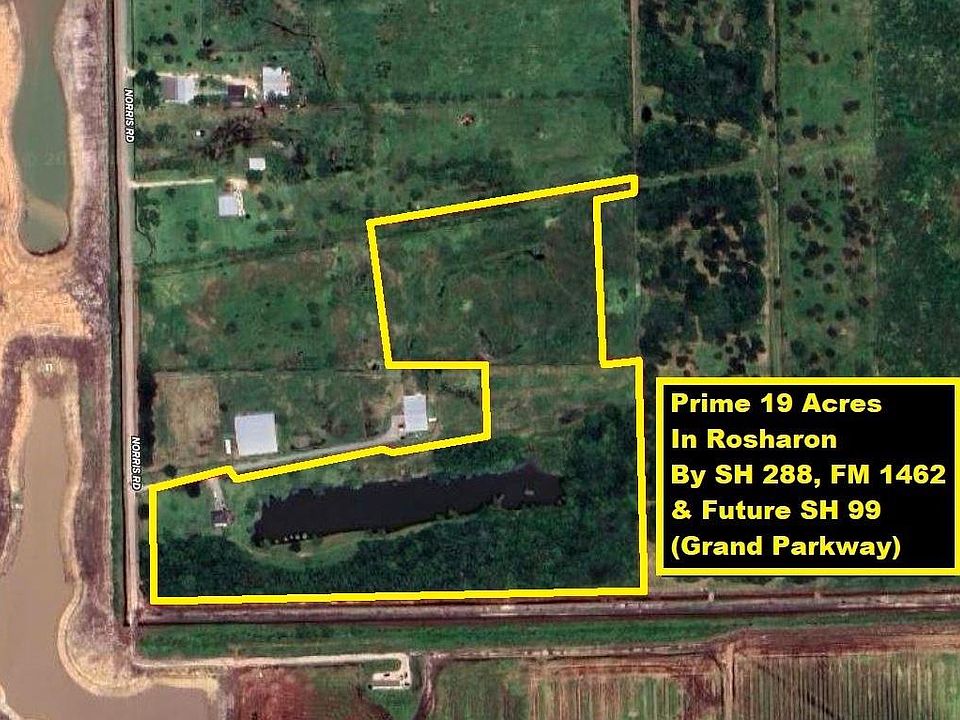 An exceptional investment opportunity awaits on Norris Road in Rosharon, strategically located by SH 288, FM 1462, and the future SH 99/Grand Parkway (see map). This 19-acre property is perfectly positioned within one of Brazoria County's fastest-growing areas, offering easy access to amenities in nearby Houston (30 miles), Pearland (15 miles), and Manvel (13 miles). Exceptional rural property offering both a peaceful retreat and a smart, forward-looking investment, this sizable parcel is strategically located adjacent to the new Preservation Creek community. Featuring 312 feet of frontage on Norris Road, the land holds the most value and is ripe for long-term development. A 1,700+ sq. ft. home with a lake-view deck is on site, livable but in need of significant renovation. Seize this opportunity to build your dream ranch, a custom estate, or capitalize on future development possibilities. Invest in Texas land with endless potential!
