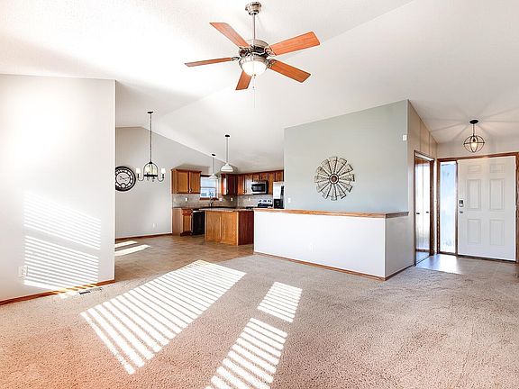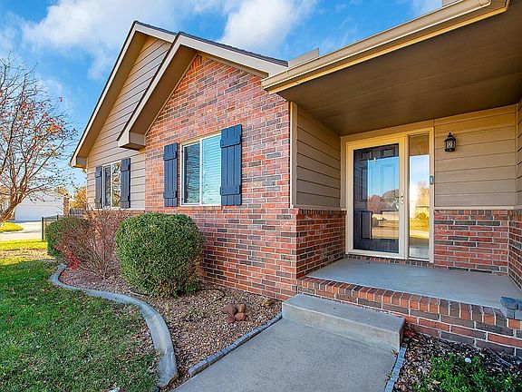 This Copper Gate North home features peaceful water views, a functional floor plan, and plenty of extras! Curb appeal is an A+ with beautiful landscaping, brick masonry, and quaint shutters. The 3 car garage has epoxy flooring for easy cleaning and insulated walls for those cold Kansas winters. The heart of the kitchen is the large island with granite top. The island provides casual seating, plenty of storage, and roll-out shelves for easy access. In fact, the entire kitchen has been outfitted with those convenient roll out shelves! All the appliances are included here - including the washer and dryer! The dining area in the kitchen is bright with sunlight thanks to the large glass back doors with integrated blinds. Fido has his own door, too; no nose prints on the glass, thanks to the built-in doggie door! The picture window in the living room features that beautiful lake, and the vaulted ceilings make everything feel bigger and better. The primary bedroom has an ensuite bath with walk-in shower, double vanity, and walk-in closet. Two more bedrooms, a full bath, and hallway linen closet complete the main floor. The lower level has plenty of space in the large rec room, which is flanked by another bedroom with egress window and a large bonus room for you to set up your home office, home gym, or game room. A full bathroom and storage room (with epoxy flooring) complete the basement. The large corner lot is fully fenced and stays green with the sprinkler system on an irrigation well. The back covered patio is accented with cafe lights and is the perfect place to spend an evening or watch those summer storms roll by. This home is located in the desirable and award-winning Maize school district.