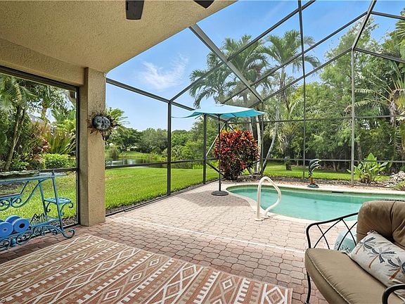 This beautiful pool home will be your home away from home. Spend the cold winter months, soaking up the sun in a desirable gated community in North Naples. This popular model is 1774 sq ft with 2 bedrooms plus a den with 2 full baths. Your beautiful pool will be the centerpiece to the backyard oasis with a sundeck and beautiful side patio with a wood burning fireplace backing to a nature preserve. The large lot is in a quiet cul-de-sac and has plenty of room for a fenced yard. The kitchen is bright & light with a cozy breakfast nook and bar area. The home has vaulted and volume ceilings throughout. The master bedroom is large with lots of natural light and oversized walk-in closet. Saturnia Lakes is an award-winning community only 15 minutes from beaches that offers resort style living. It offers: 2 heated pools, hot tub, updated fitness room, dance studio, internet cafe, saunas, billiards room, ballroom, clay tennis courts, playground, basketball court, and putting green. A rated schools and minutes from shopping and restaurants makes this is a must-see home. Owner is ok with 1 small dog.