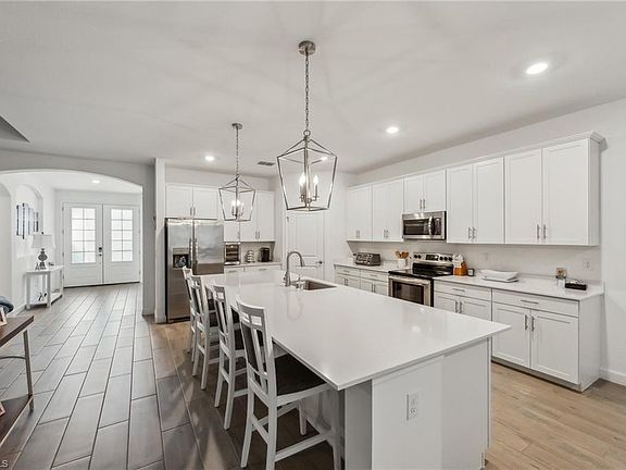 Beautiful barely lived in Summerville II rancher built by Lennar in 2022 with all of the upgrades located in the Prestigiuos Valencia Golf & Country Club. This home has upgraded sleek all white quartz countertops and white cabinets all throughout the home. Also, upgraded hurricane impact tinted glass and wide 6' tile flooring throughout. Enjoy the heated pool and spa outback in your extended lanai all year long. Owner aslo upgraded automatic pool filler and automatic roll down hurricane shutters for convienience. Oversized 3 car garage in a great gated community. Low HOA fees. Home sits on a middle perfectly oversized lot facing landscape and wooded area for privacy.