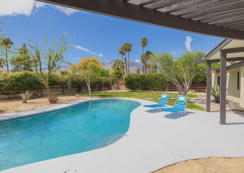 Palm Springs pool home perfect for Short-Term Rental or primary residence in quiet neighborhood! Extended land lease to 2077! Freshly painted inside and out. Vaulted ceilings in the main living area, open floor plan with ambient light. Ceiling fans and plantation shutters throughout. New AC unit installed last year. Wood plank porcelain tiles in primary areas with tile in the bedrooms. Three spacious bedrooms and two full bathrooms. Attached one-car garage completely repainted. Beautifully landscaped backyard features private pool, green grass, and AMAZING unobstructed mountain views. Pool deck was just repaired and painted. This home presents incredible value and is close to park, schools, downtown shopping, and dining! At time of listing, Vista Norte subdivision is at 14.57% STR density. *