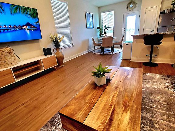 Fully Furnished Home. Enjoy your stay at a newly built and fully furnished home with a view. Very inviting, minimalist and peaceful space. All bedrooms are upstairs. Kitchen, living room, half-bathroom and garage are downstairs. Enjoy the view from the back patio and upstairs main bedroom to an open field. Single car garage has 220-volt electric car outlets. Samsung 65 inch smart TV provided in the living room, so that you can sign in to your favorite streaming apps. Another Samsung smart TV upstairs in the main bedroom. Gated community with outdoor playground and walking trails.